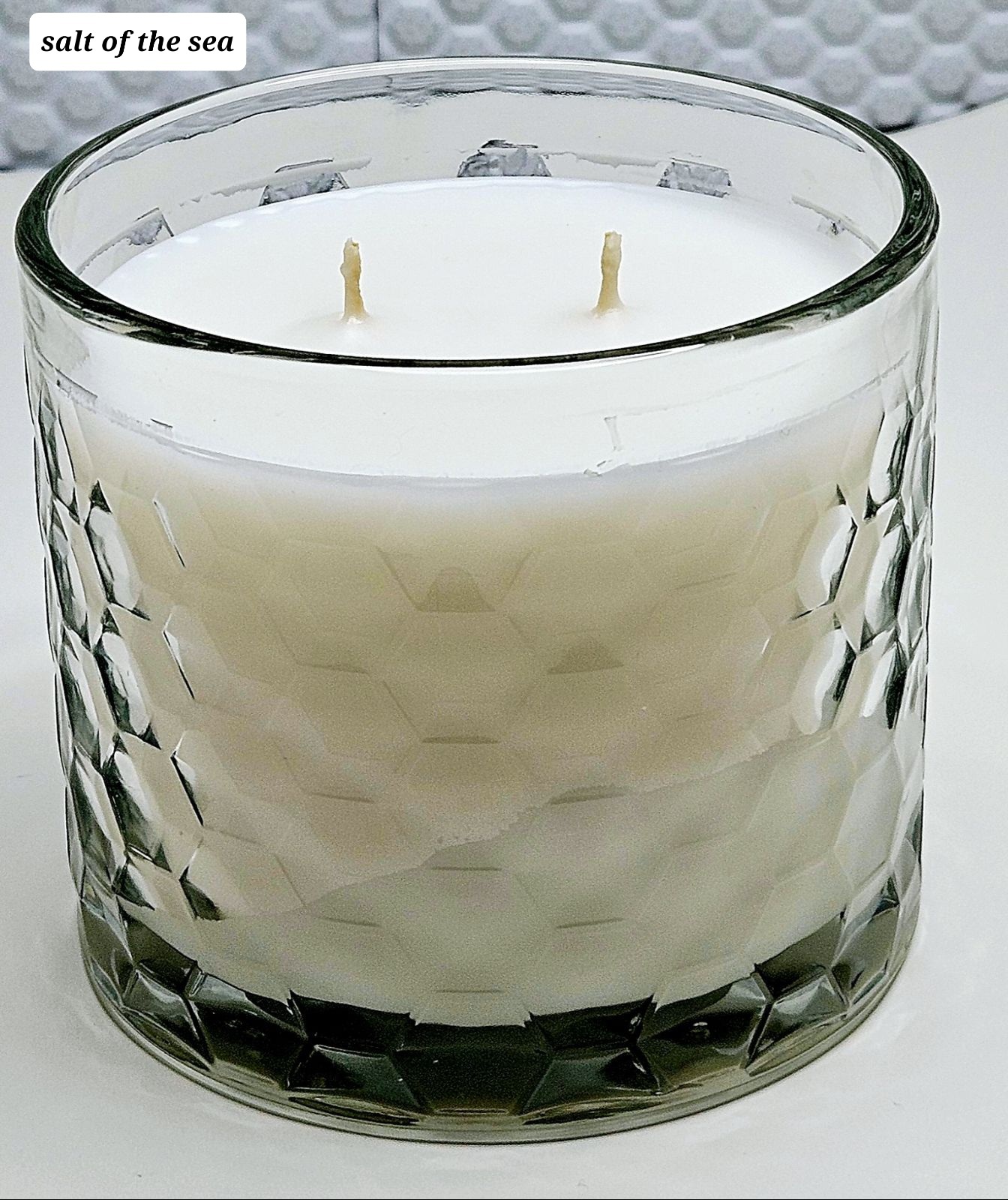 Every candle has been crafted with the finest ingredients such as our fragrance oils and essential oils each candle is 12 oz. they all last a long time around 30 plus hours and don't put off smoke or soot. sea salt